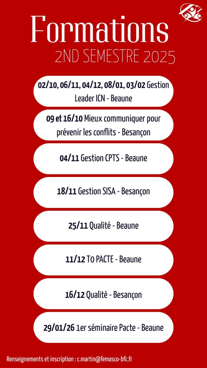 Pour obtenir plus d’informations contacter Chloé MARTIN – Chargée de mission Formation et Innovations en Santé – c.martin@femasco-bfc.fr 03.81.47.08.22