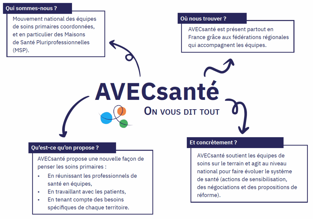 Le mouvement AVECsanté est représenté dans toute la France par les fédérations régionales qui répondent aux besoins des usagers et des professionnels de santé, et répondent de façon agile aux besoins de santé croissants. Des partenariats sont développés pour innover et répondre aux besoins des usagers, des professionnels de santé avec notamment France Assos Santé, la MSA, l’Assurance Maladie, l’EHESP, la HAS, etc.